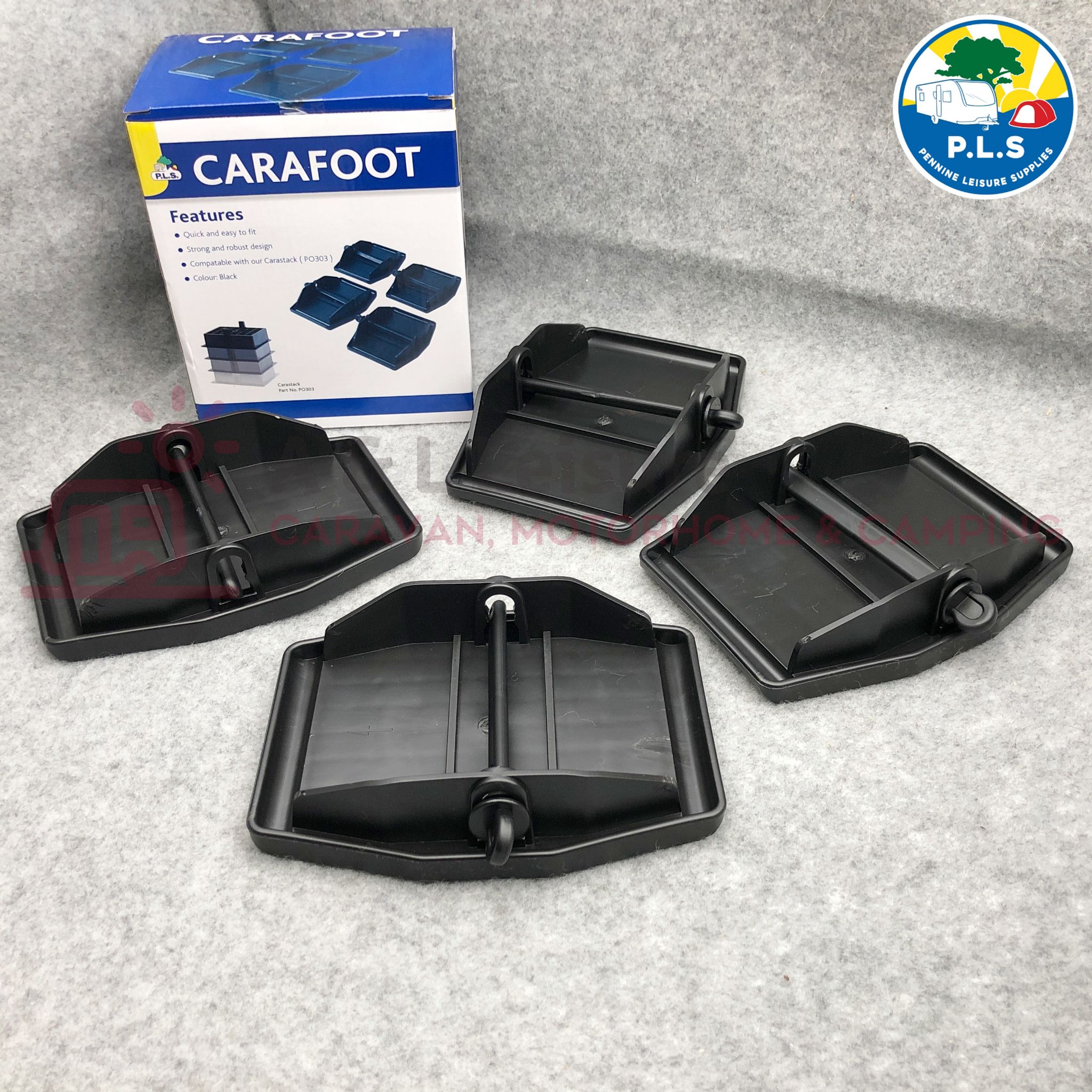 4 x easy fitting plastic corner steady jack pads. These provide stability to your caravan/motorhome and prevent the legs from sinking into the ground.